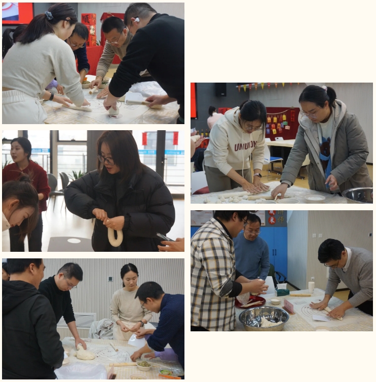 緊接著,重頭戲包餃子開始啦!無論是廚藝高手,還是廚房小白,大家都躍躍欲試,迫不及待的展示身手,共同感受咱們中華傳統美食的制作樂趣。和面、切塊、調餡、包餃子......新手們在”老江湖們“的耐心指導下,也能做的有模有樣。大家分工配合,很快就有了默契,白花花的餃子很快就鋪滿了桌。